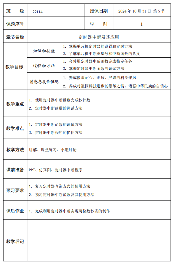 网站类目:教学设计 活动级别:校级 活动类别: 执教姓名:龚文飚 所在单位:江阴市教育局 执教时间:2024-10-31 执教地点:5401 执教内容:定时器中断及应用 参加对象:22114