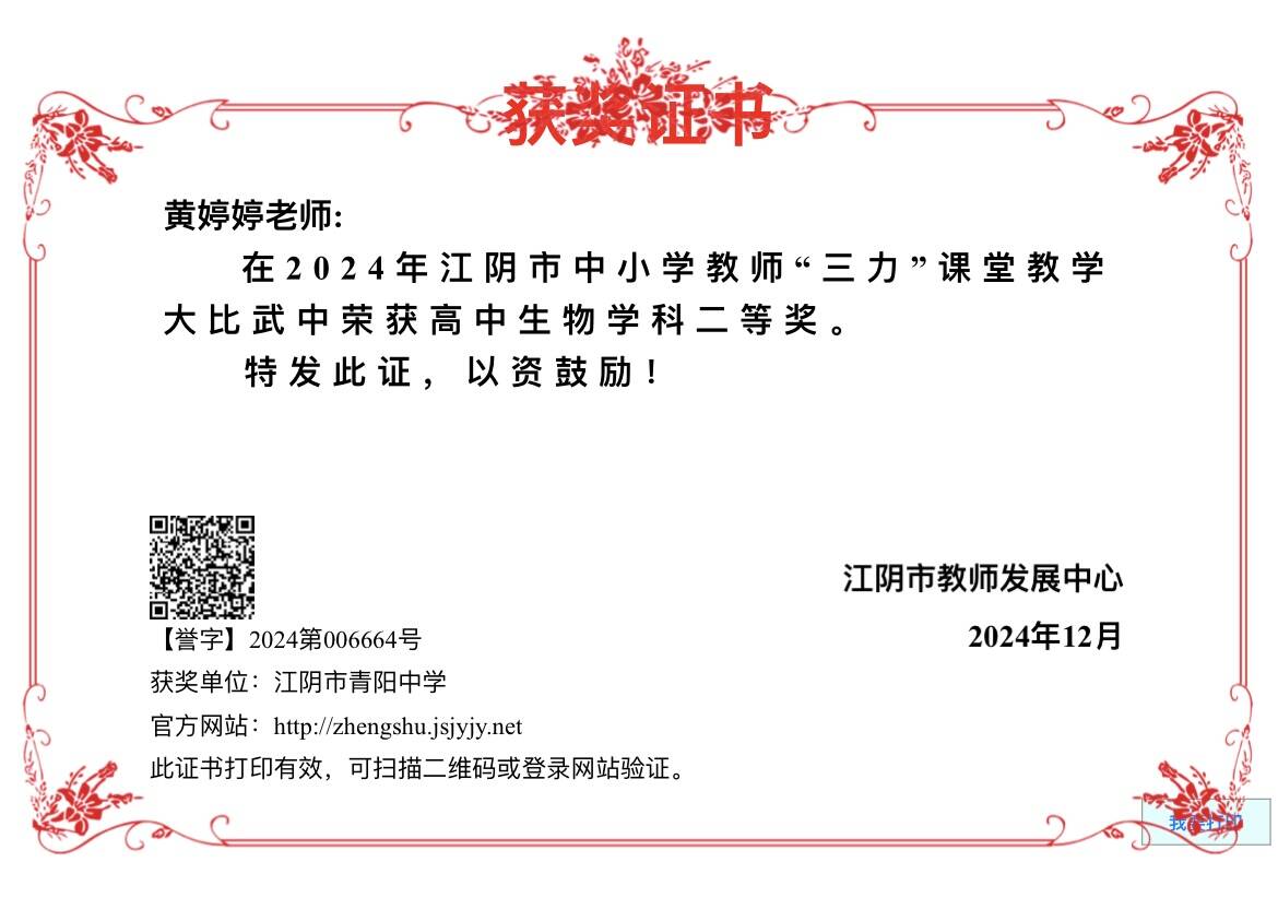 网站类目:学科比赛情况 姓名:黄婷婷 所在单位:江阴市青阳中学 获奖类别:三力课堂教学大比武 获奖级别:市级 获奖等级: 获奖时间:2024-12-13 评比部门: 发表刊物: 刊物级别:市级 发表时间:2025-09-17