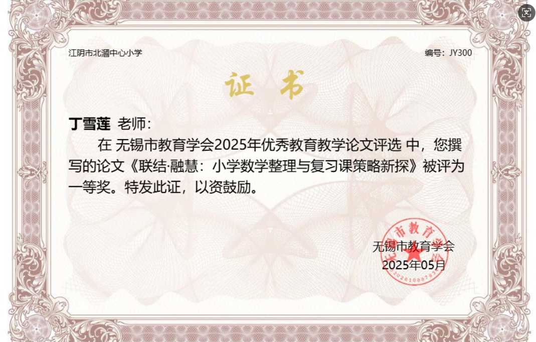 丁雪莲的研究论文《联结 融慧:小学数学整理与复习课策略新探》获无锡市一等奖 2025-09-17