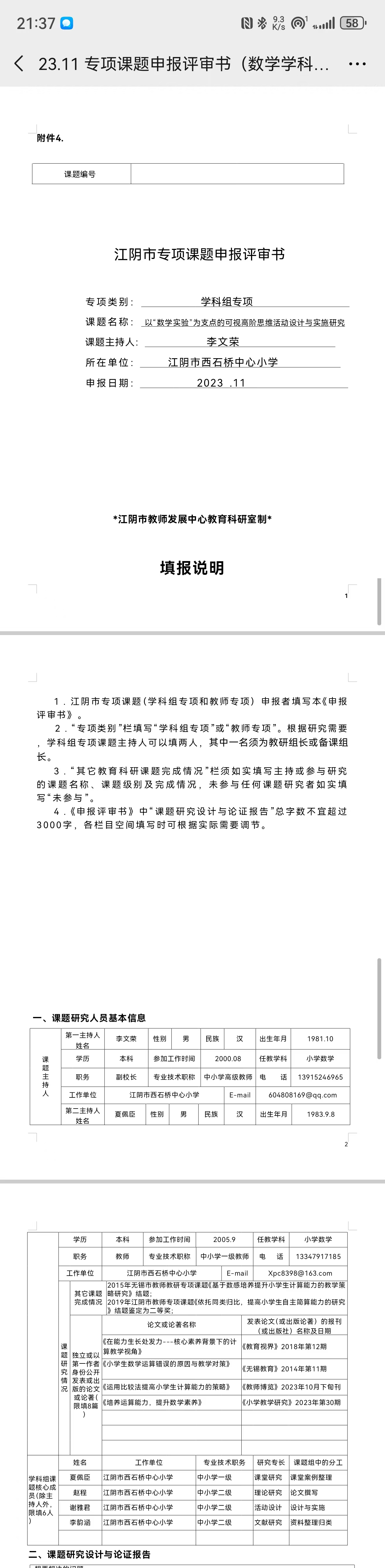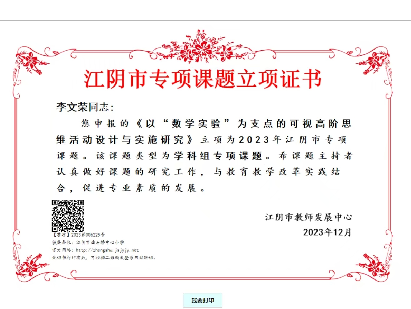 夏佩臣参与江阴市学科组专项课题《以“数学实验”为支点的可视高阶思维活动设计与实施研究》立项 2025-09-17