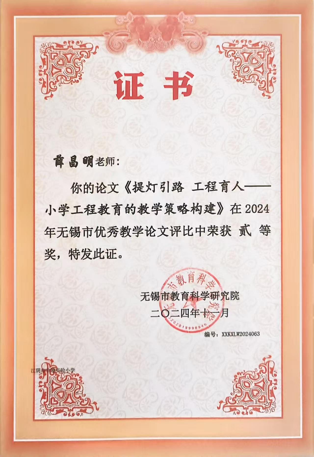 薛昌明老师在2024年无锡市优秀教学论文评选中获二等奖