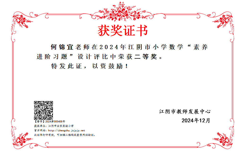 何锦宜——江阴市小学数学“素养进阶习题”设计评比获二等奖