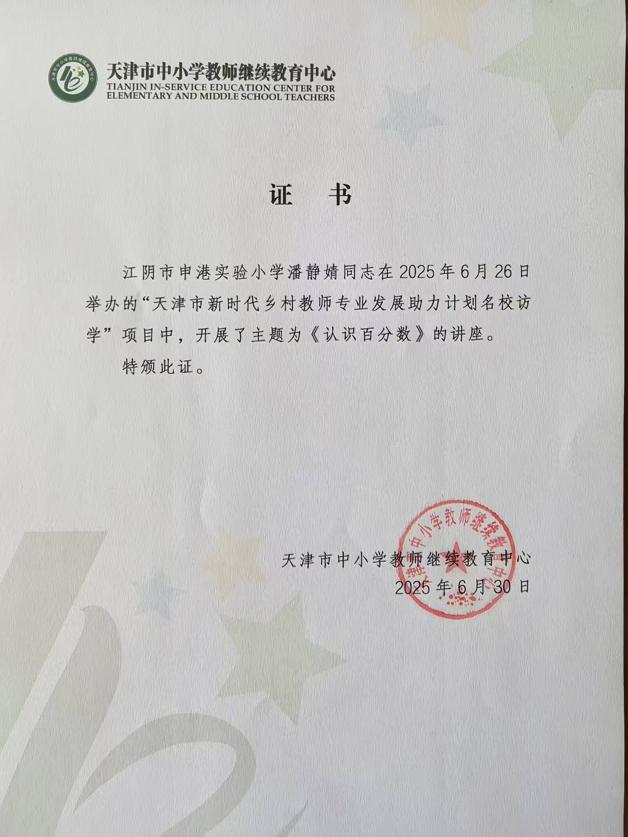 潘静婧在“天津市新时代乡村教师专业发展助力计划名校访学”活动中作讲座《认识百分数》(省级)