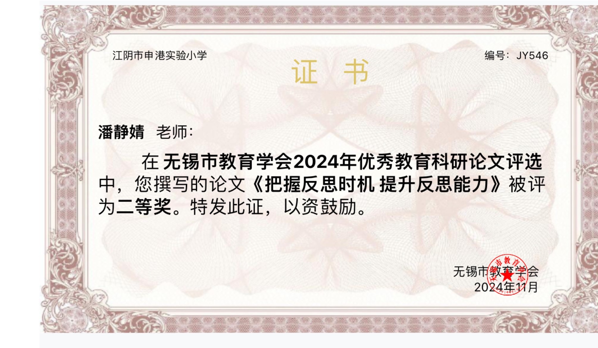 潘静婧在无锡市教育学会2024年优秀教育科研论文评选中获二等奖