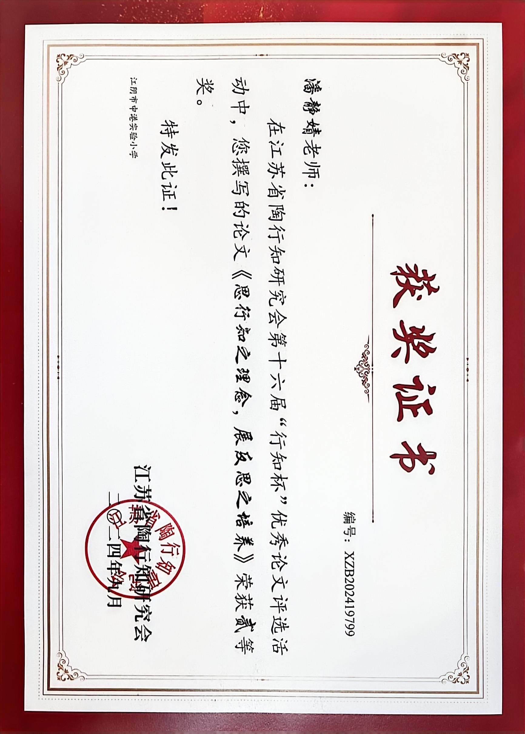潘静婧在江苏省陶行知研究会第十六届“行知杯”优秀论文评选活动中获二等奖