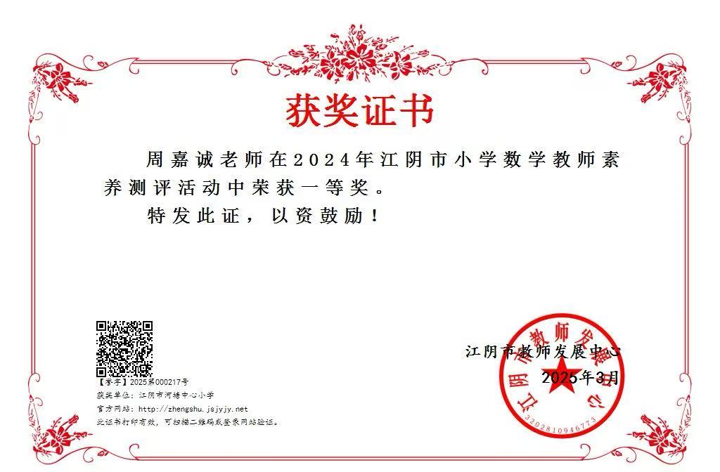 周嘉诚——江阴市小学数学教师素养测评活动获一等奖