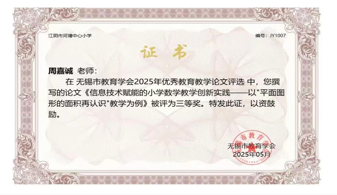 周嘉诚——论文《信息技术赋能的小学数学教学创新实践》获无锡市三等奖 2025-09-18