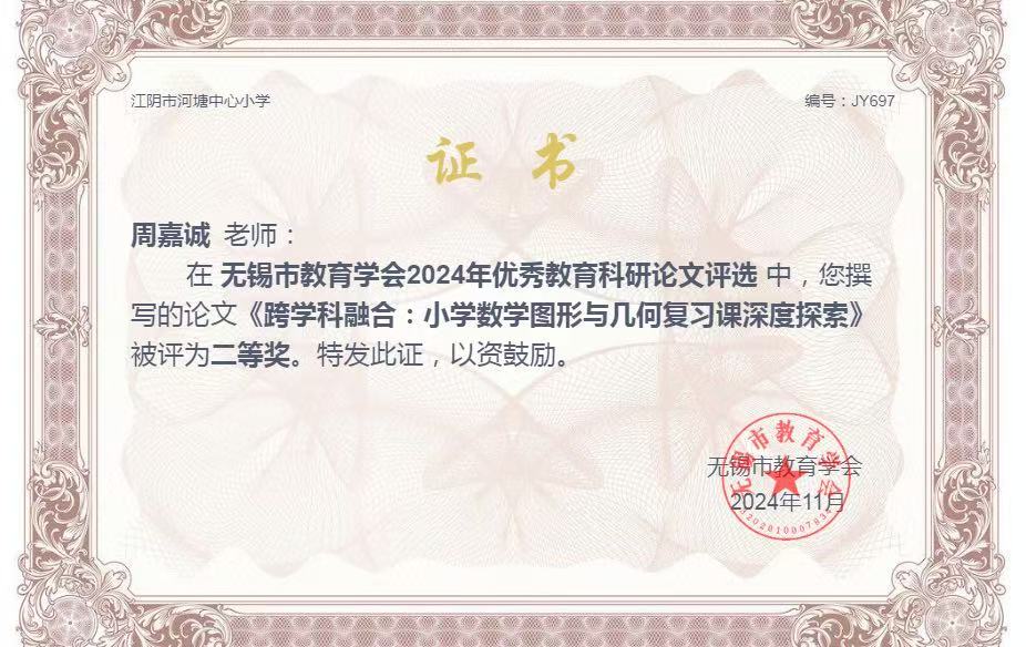 周嘉诚——论文《跨学科融合:小学数学图形与几何复习课深度探索》获无锡市二等奖 2025-09-18