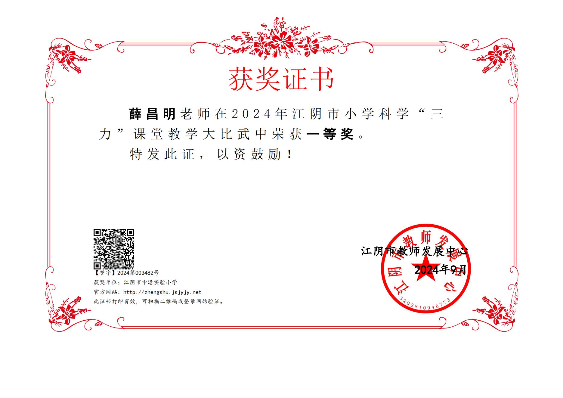 薛昌明老师在2024年江阴市小学科学“三力”课堂教师大比武获一等奖