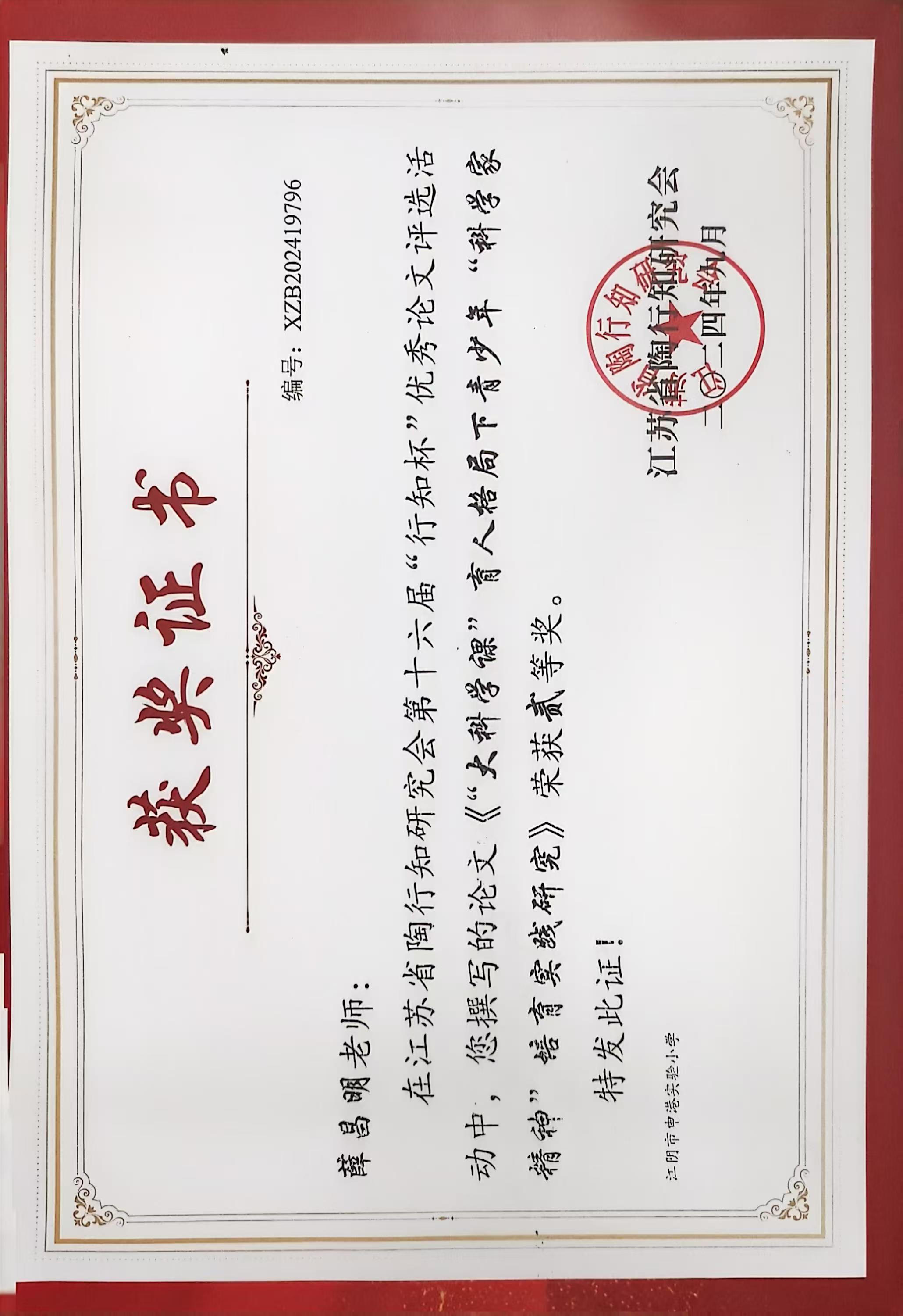 薛昌明老师在2024年江苏省行知杯优秀论文评选活动中获二等奖 2025-09-18