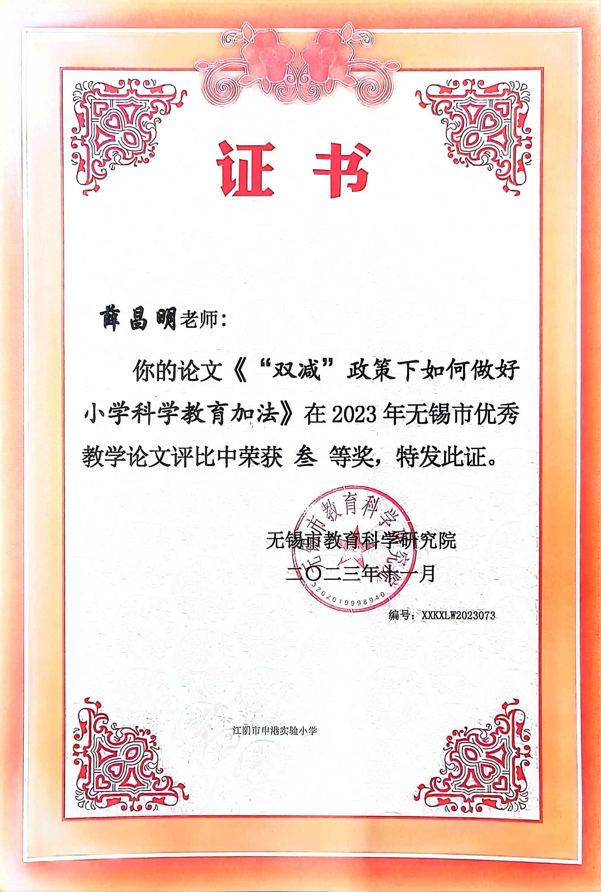 薛昌明老师在2023年无锡市优秀教学论文评比中获三等奖