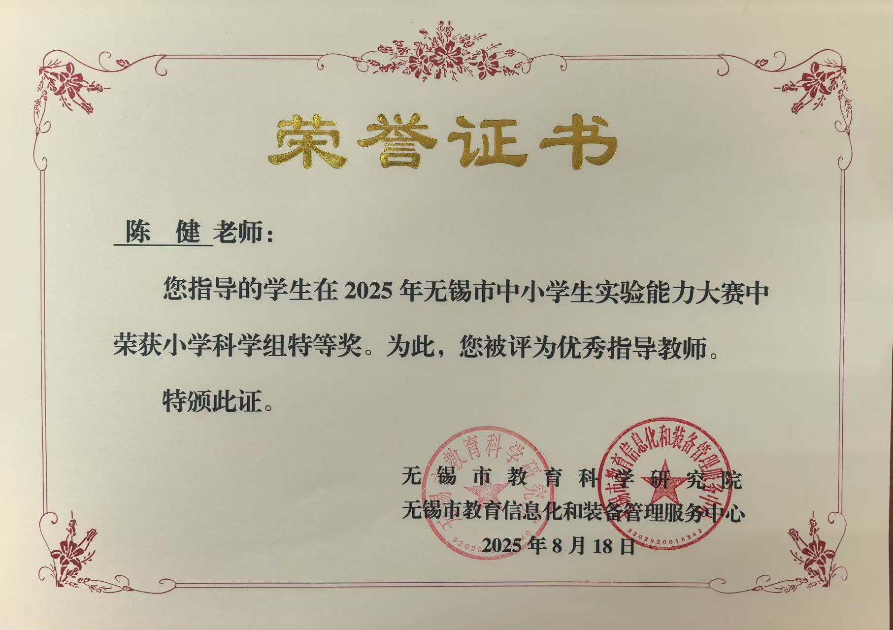 陈健-无锡市中小学生实验能力大赛优秀指导教师