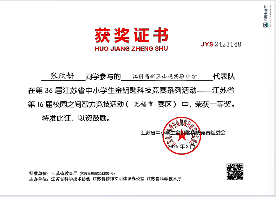 徐文星—张欣妍—第36届江苏省中小学生金钥匙科技竞赛(无锡赛区)一等奖