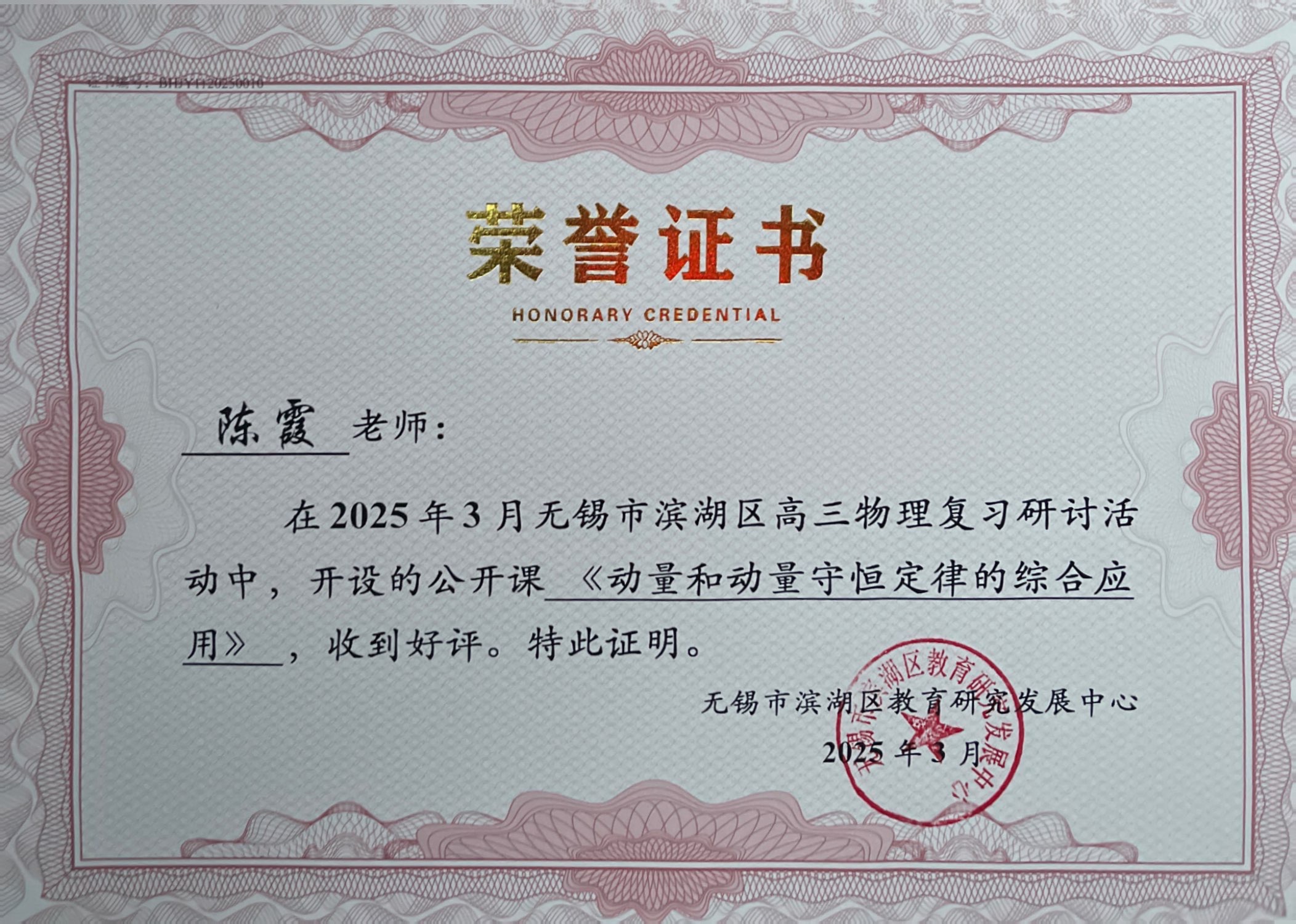 陈霞老师在无锡市滨湖区高三物理复习研讨活动中开设《动量和动量守恒定律的综合应用》公开课 2025-09-18