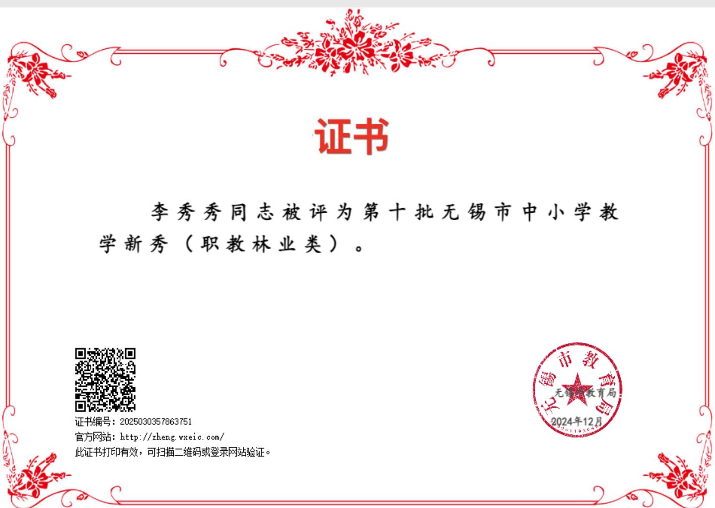 李秀秀同志被评为第十批无锡市中小学教学新秀(职教林业类)