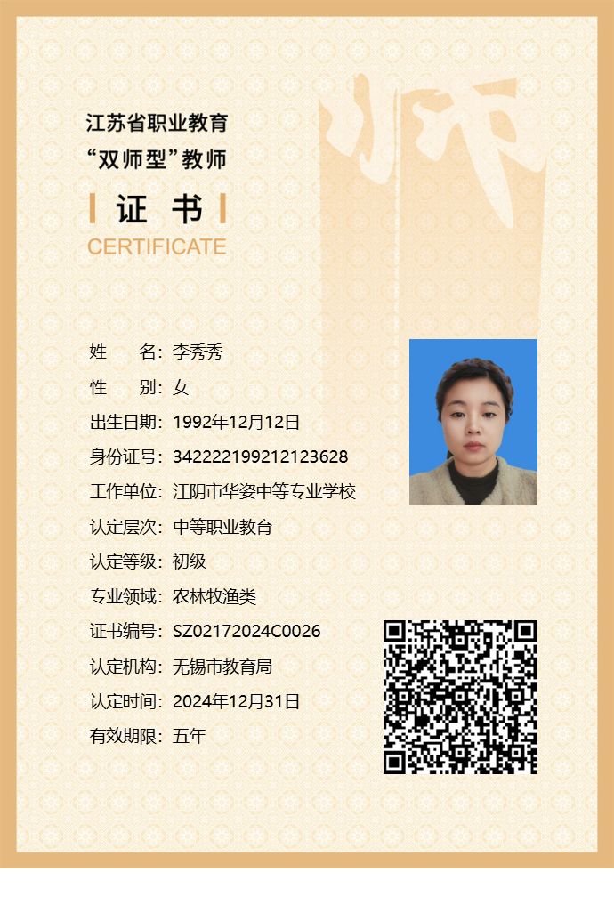 李秀秀老师获评江苏省职业教育 “双师型”教师
