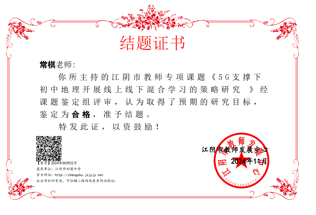 常棋所主持的江阴市教师专项课题《5G支撑下初中地理开展线上线下混合学习的策略研究》顺利结题 2025-09-18