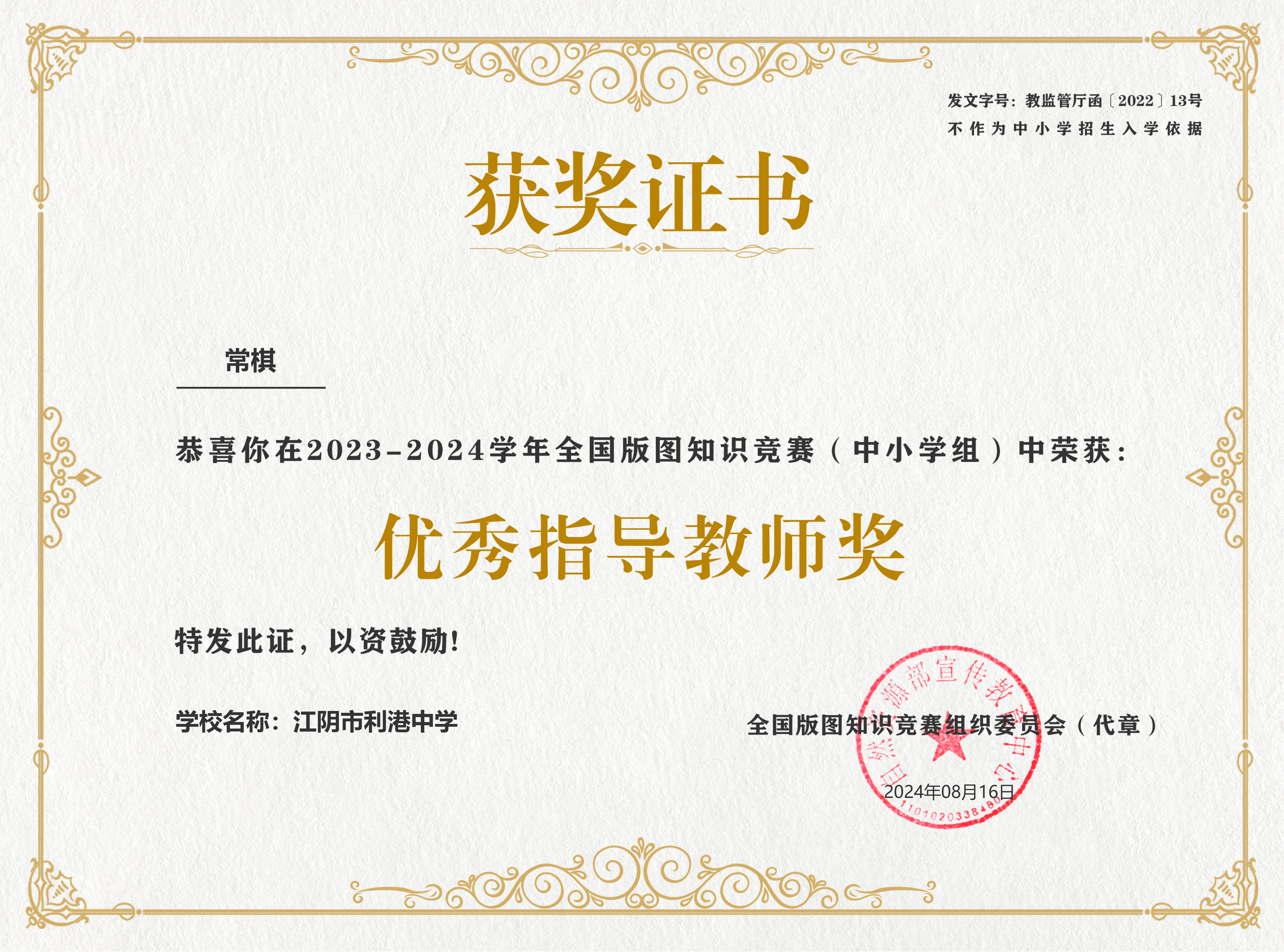 常棋老师在2023-2024学年全国版图知识竞赛(中小学组)中荣获优秀指导教师奖