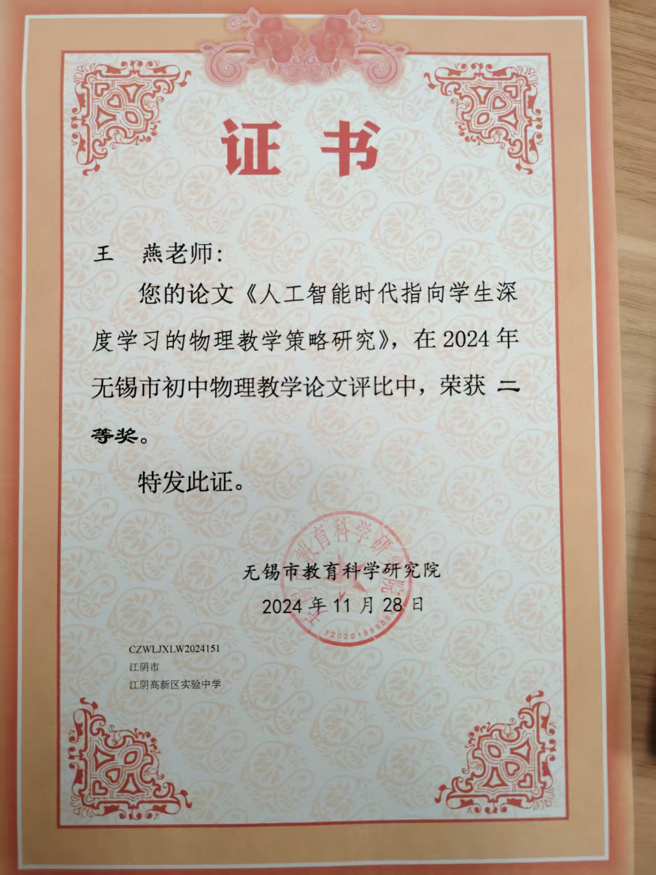 王燕《人工智能时代指向学生深度学习的物理教学策略研究》获无锡市二等奖