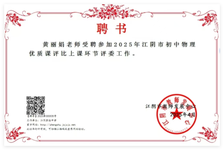 黄丽娟受聘参加2025年江阴市初中物理优质课评比评委工作