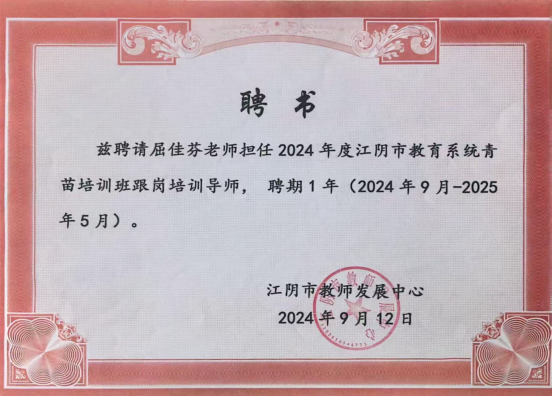 导师屈佳芬被聘为2024年度江阴市教育系统青苗培训班跟岗培训导师