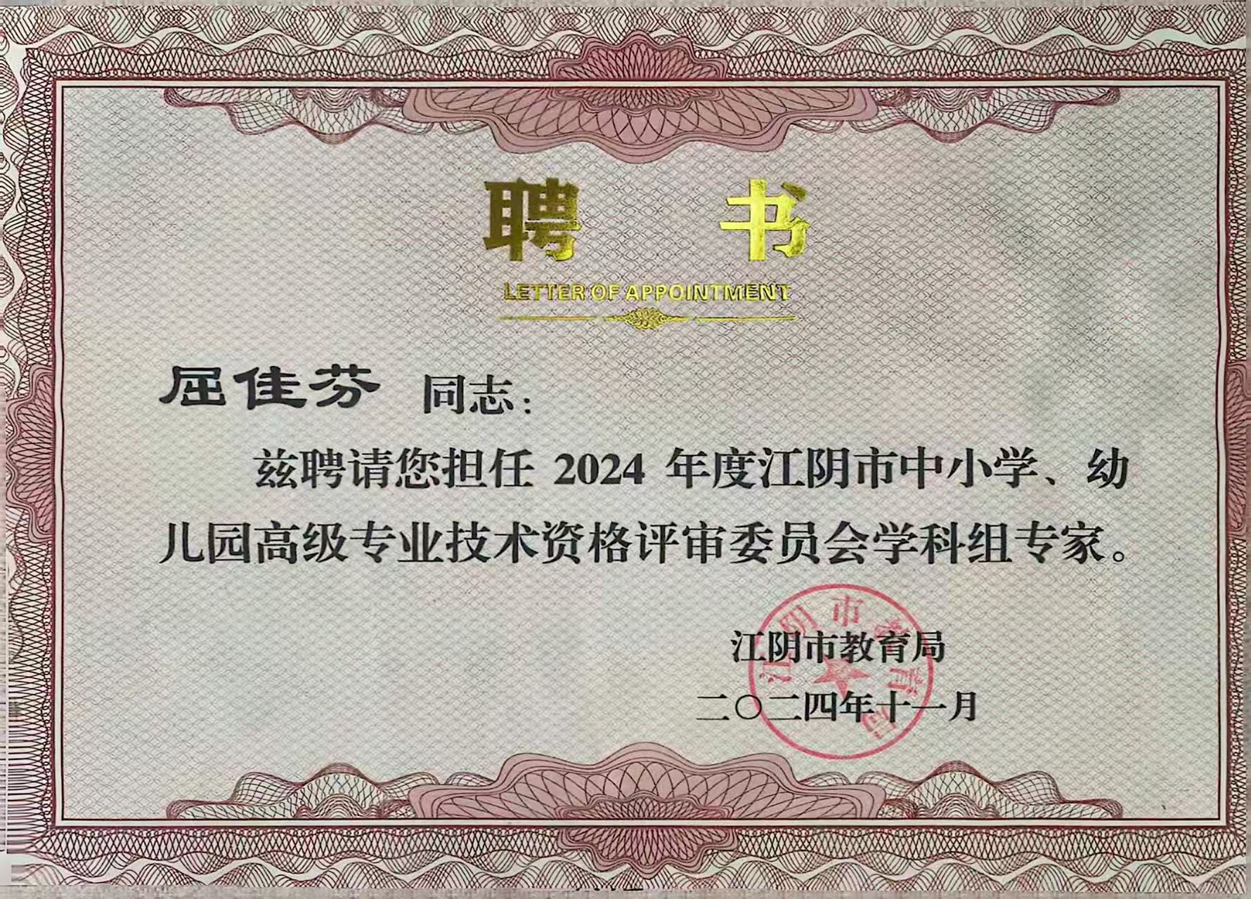 导师屈佳芬被聘为2024年度江阴市中小学、幼儿园高级专业技术资格评审委员会学科组专家