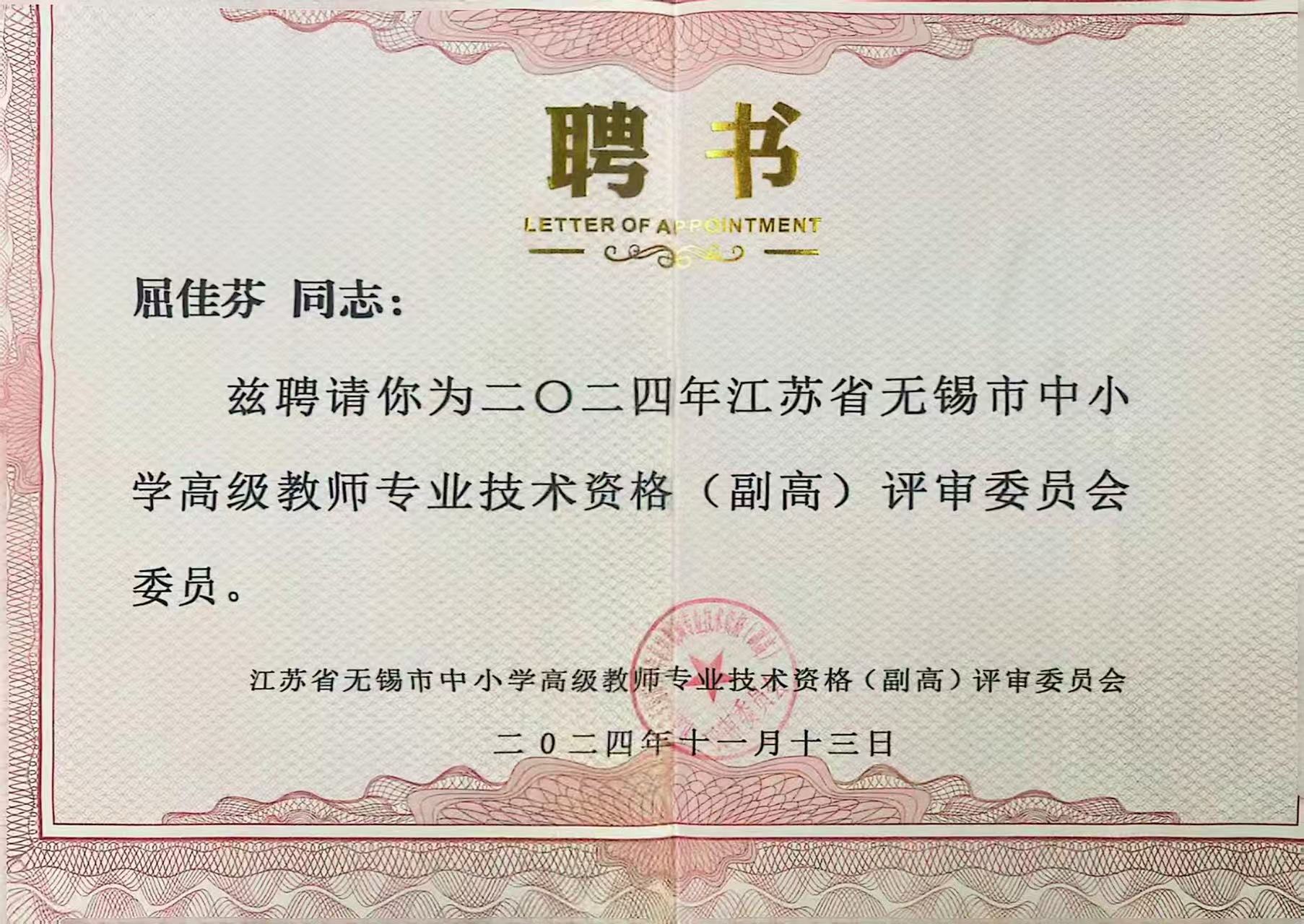 导师屈佳芬被聘为2024年江苏省无锡市中小学高级教师专业技术资格(副高)评审委员会委员