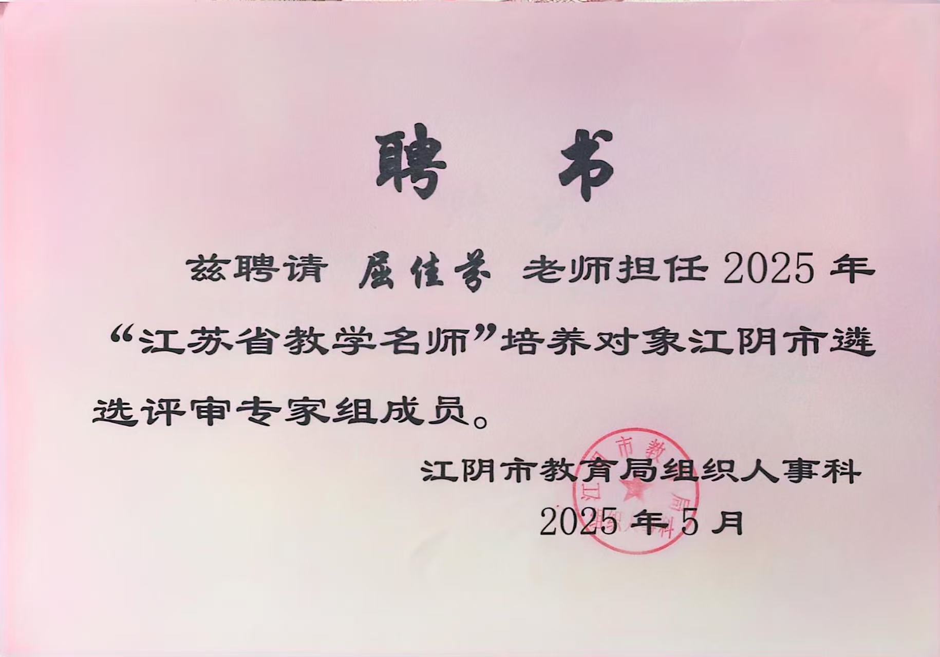 导师屈佳芬被聘为2025年“江苏省教学名师”培养对象江阴市遴选评审专家组成员