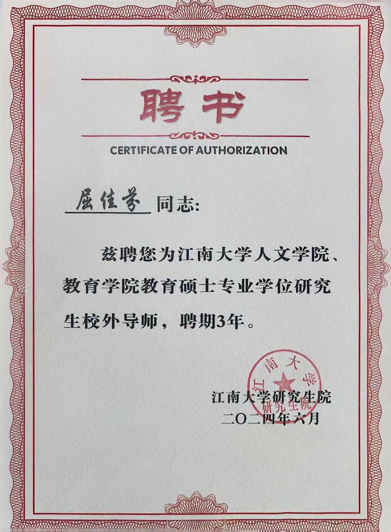 导师屈佳芬被聘为江南大学人文学院、教育学院教育硕士专业学位研究生校外导师