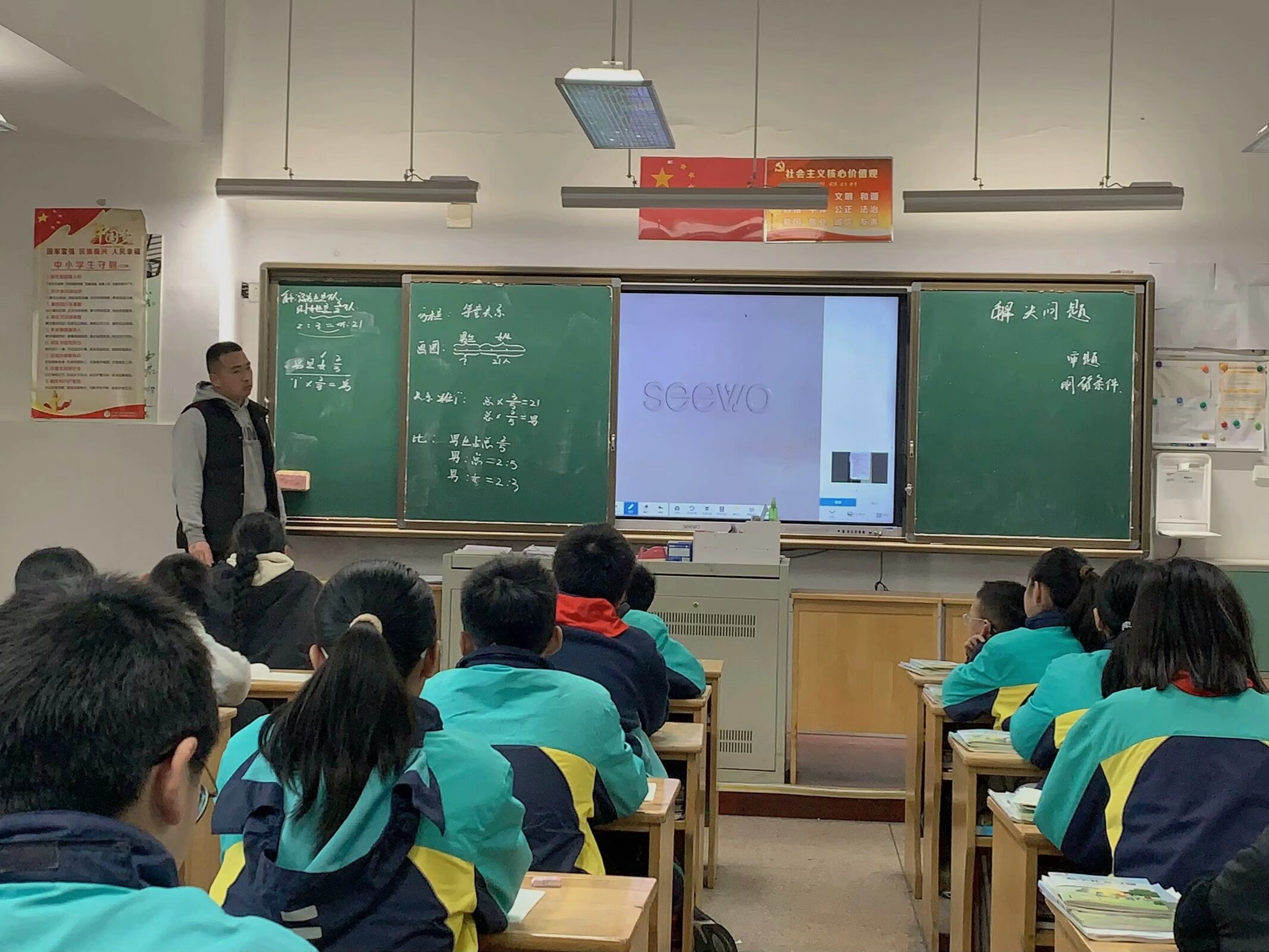 ④把作为单位“1”的女生人数设为 x,那么男生人数就是 2/3x,利用美术组一共35人,能够列方程解题……谈话:通过刚才的汇报和交流看出大家都有各自的想法,那你们最喜欢哪一种方法呢?为什么呢?(让多名学生回答,征求各自的看法。)刚才我们运用了不同的策略来解决这个问题,你们能检验一下自己做的是否正确吗?(引导学生交流检验方法)