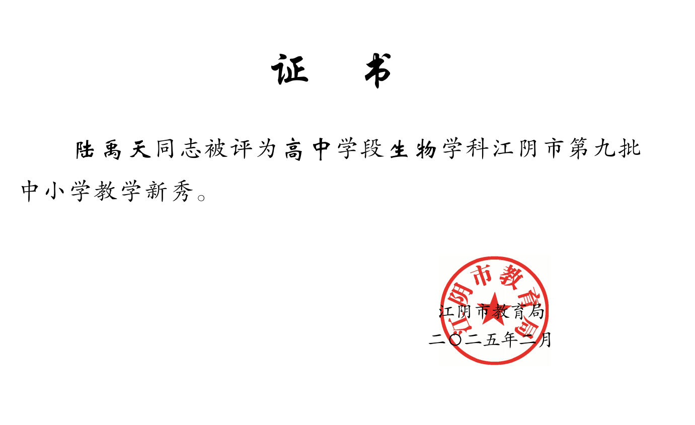 网站类目:荣誉提升情况 姓名:陆禹天 所在单位:江阴市教育局 荣誉类别:新秀 荣誉级别:县级 获得时间:2025-09-18 评比部门: