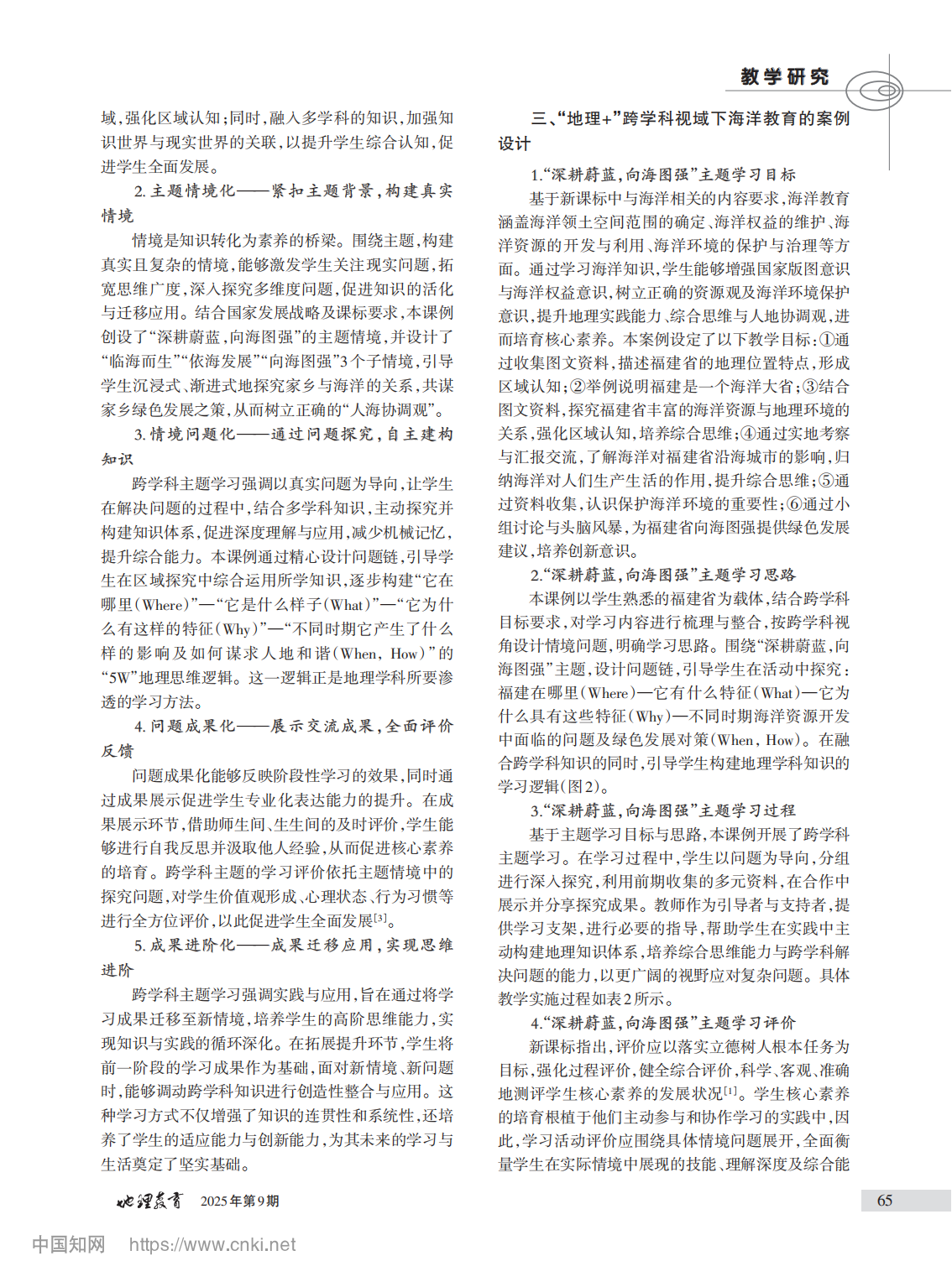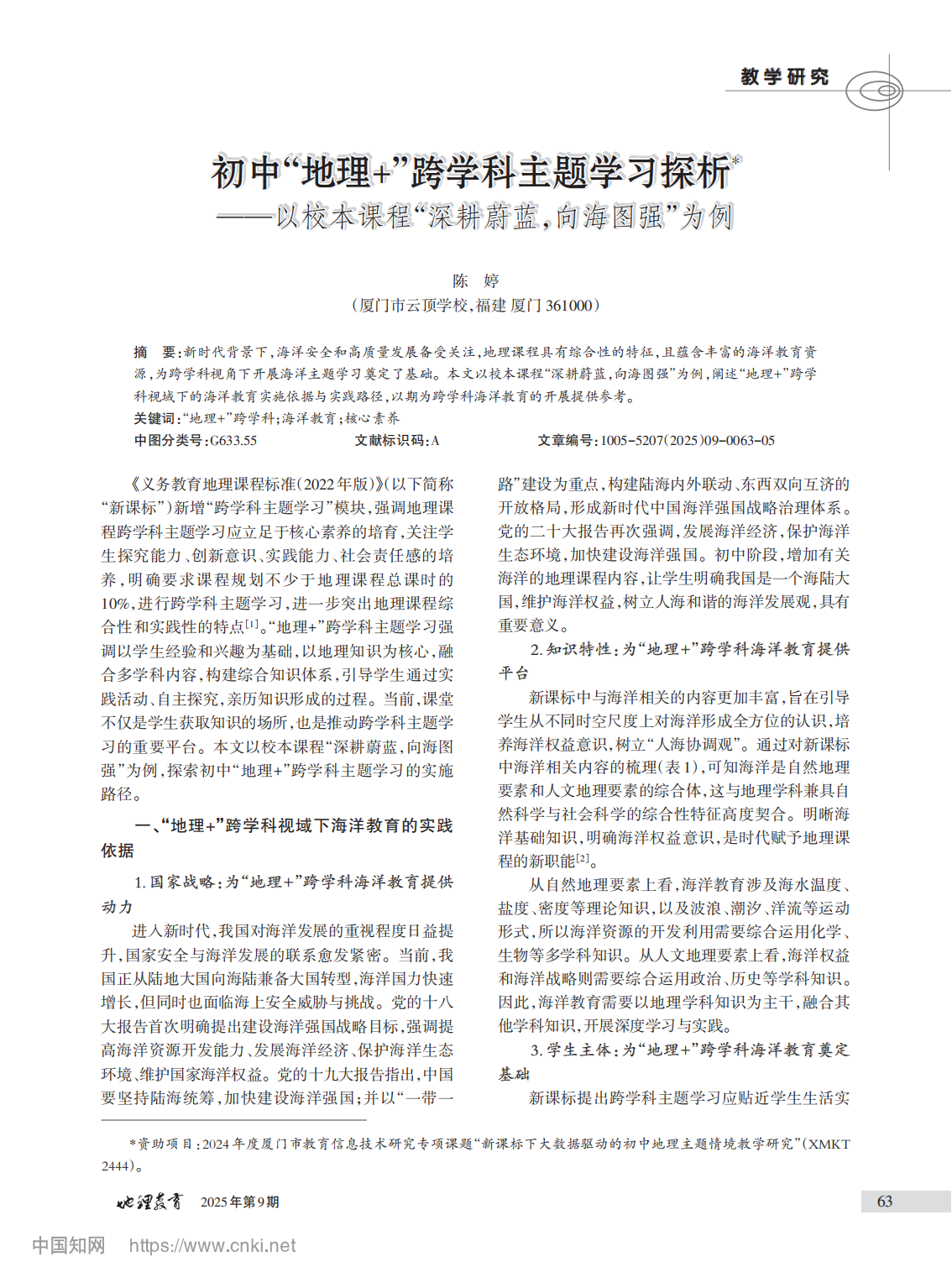 推荐《初中 “地理 +” 跨学科主题学习探析 —— 以校本课程 “深耕蔚蓝,向海图强” 为例》(陈芳推荐) 2025-09-18