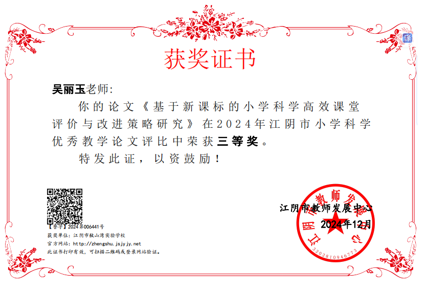 研究成果 吴丽玉 论文《基于新课标的小学科学高效课堂评价与改进策略研究》获江阴市级三等奖