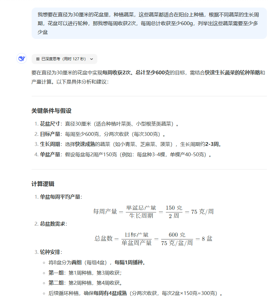 (1)“有哪些蔬菜适合在阳台上种植?”可以直接利用deepseek简单问答即可得出。