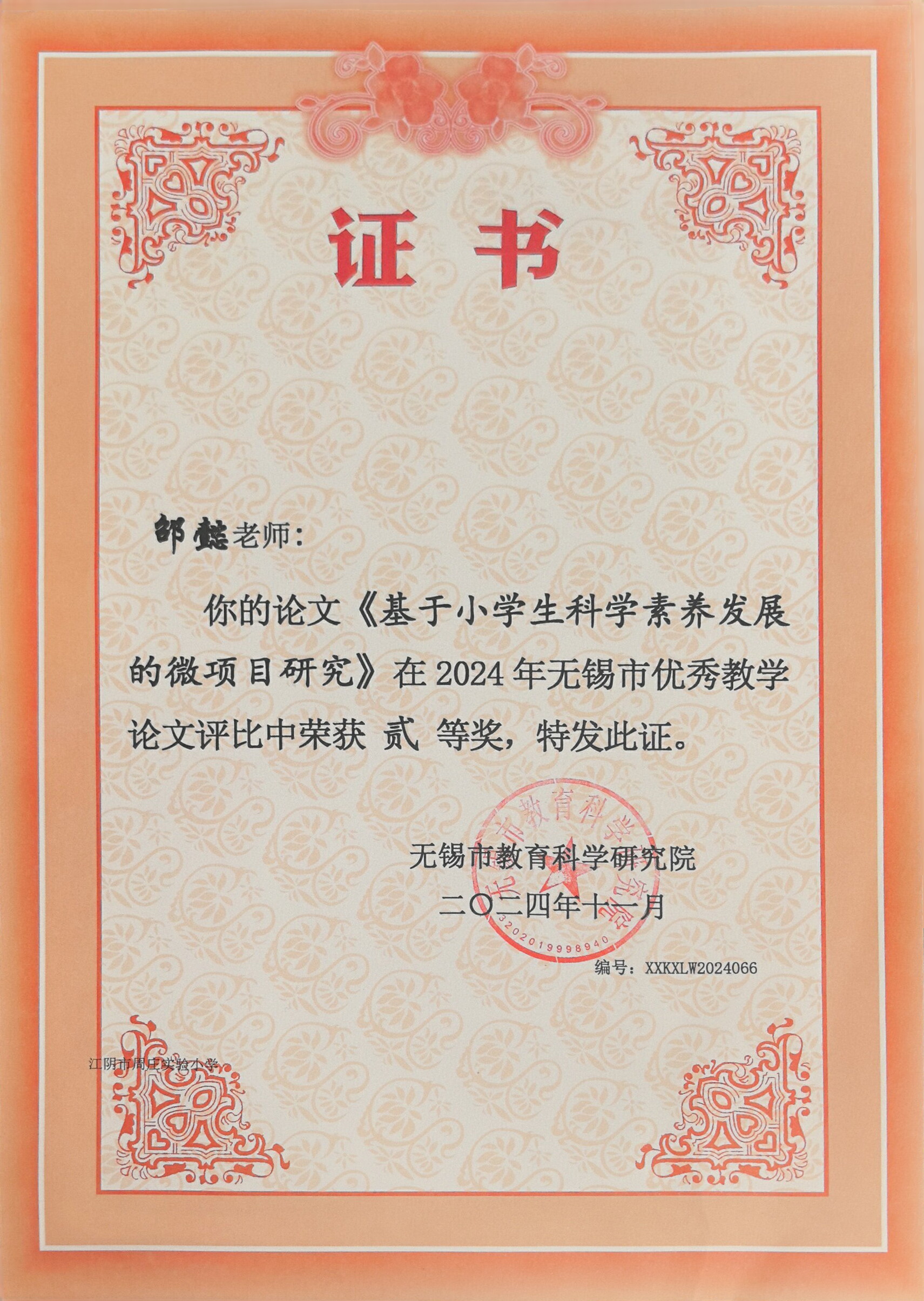 网站类目:研究成果获奖 姓名: 所在单位:江阴市教育局 获奖类别: 获奖级别:市级 获奖等级: 获奖时间:2025-09-19 评比部门: 发表刊物: 刊物级别:国家级 发表时间:2025-09-19