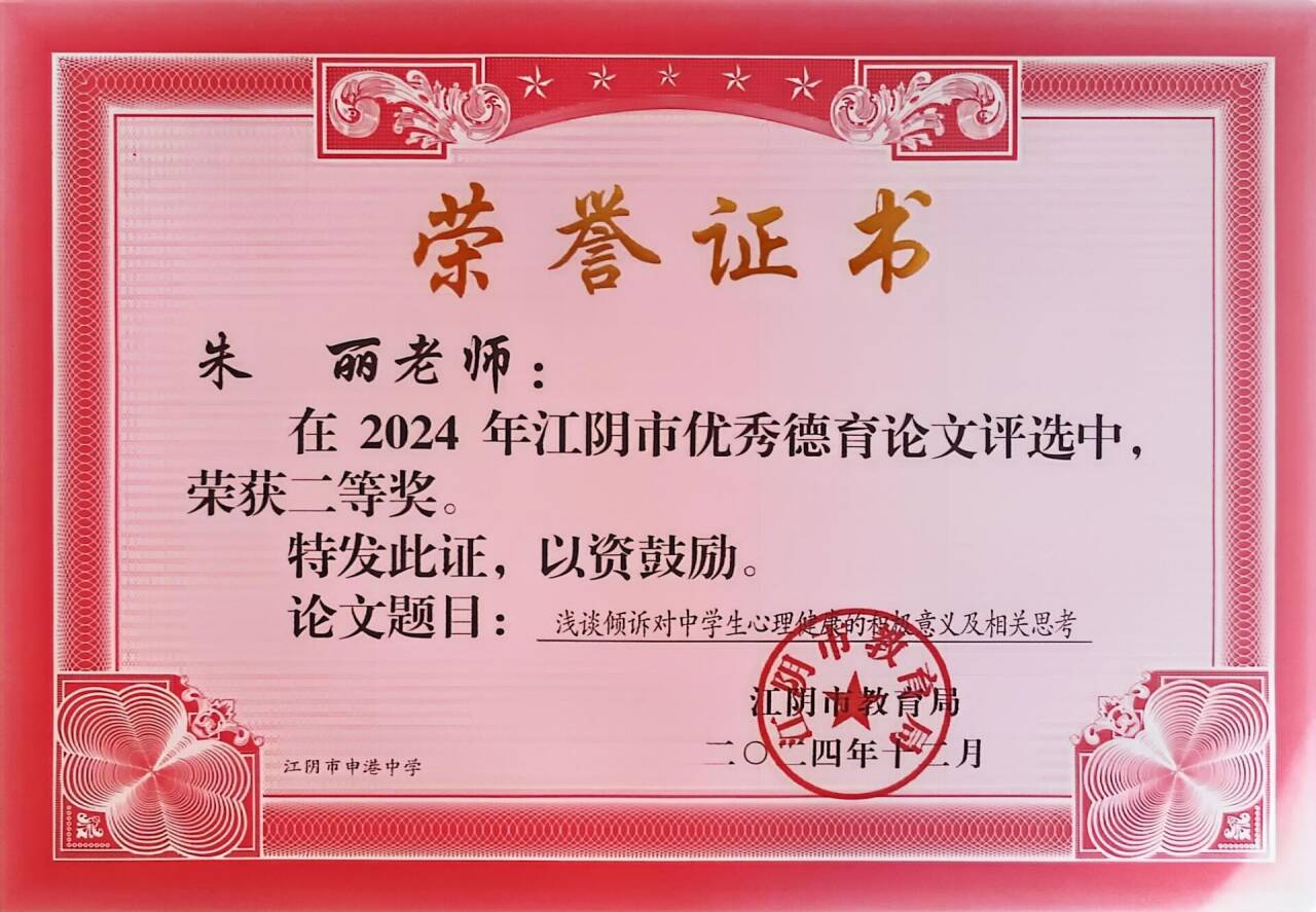 网站类目:研究成果获奖 姓名:朱丽 所在单位:江阴市申港中学 获奖类别:德育论文 获奖级别:县级 获奖等级: 获奖时间:2024-12-12 评比部门:江阴市教育局 发表刊物: 刊物级别:县级 发表时间:2025-09-19
