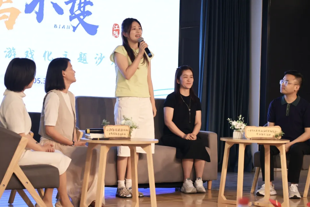 工作室学员金榴作为教师代表发言,分享十年历程。课程游戏化不仅转变了她的教育理念,更让她见证了孩子在游戏中绽放的创造力。