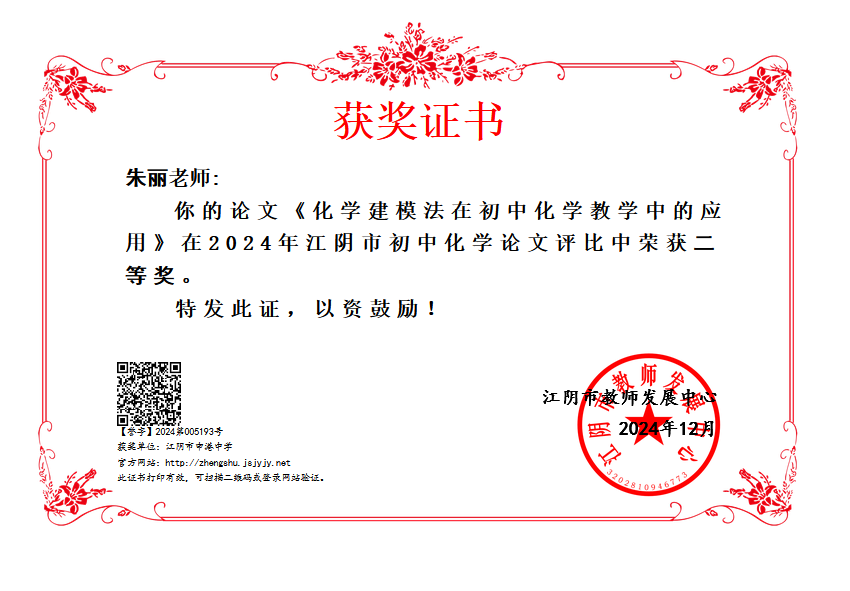 网站类目:研究成果获奖 姓名:朱丽 所在单位:江阴市申港中学 获奖类别: 获奖级别:县级 获奖等级: 获奖时间:2024-12-18 评比部门:江阴市教师发展中心 发表刊物: 刊物级别:国家级 发表时间:2025-09-19