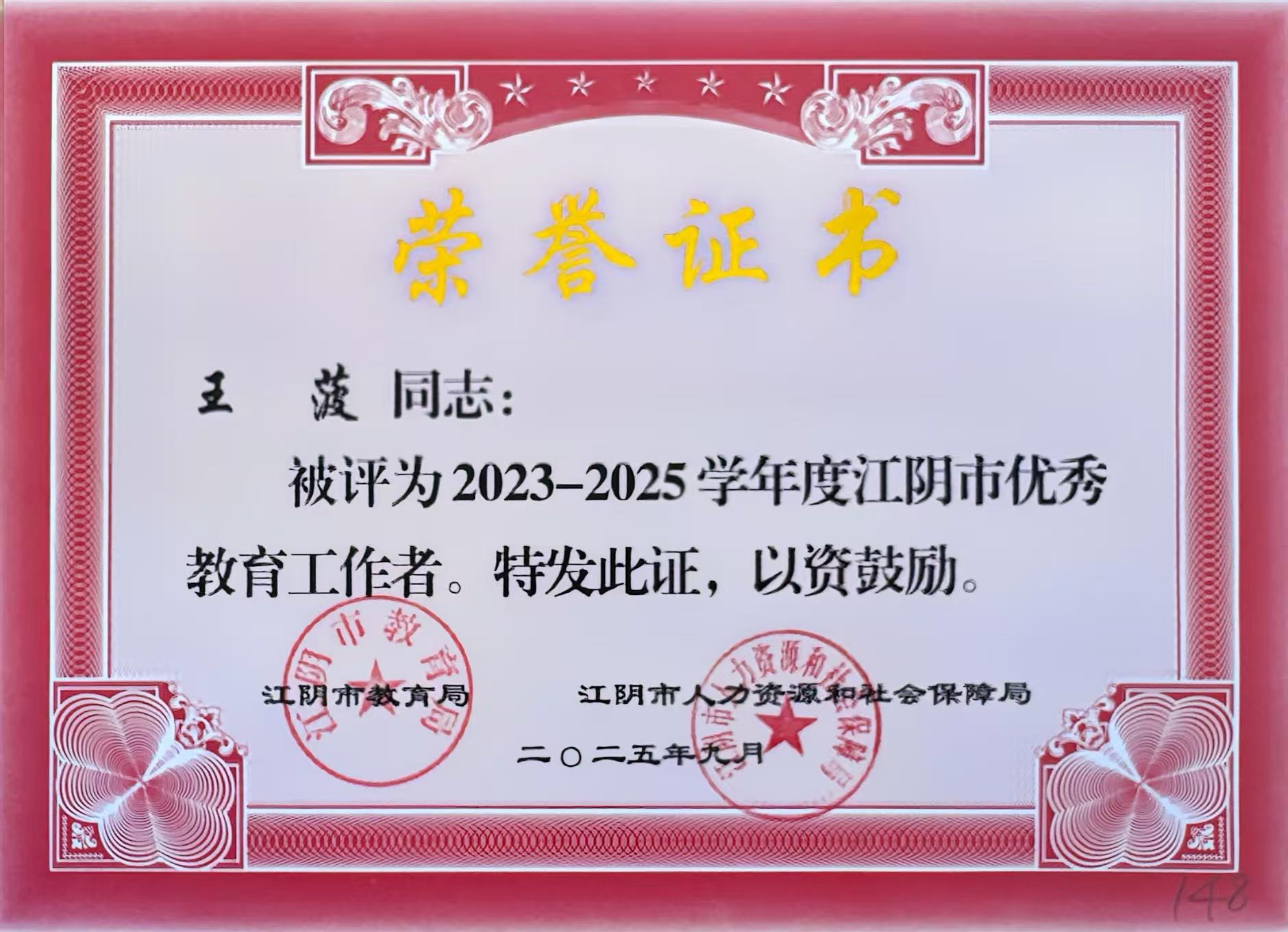 王菠老师 评为2023-2025学年度江阴市优秀教育工作者