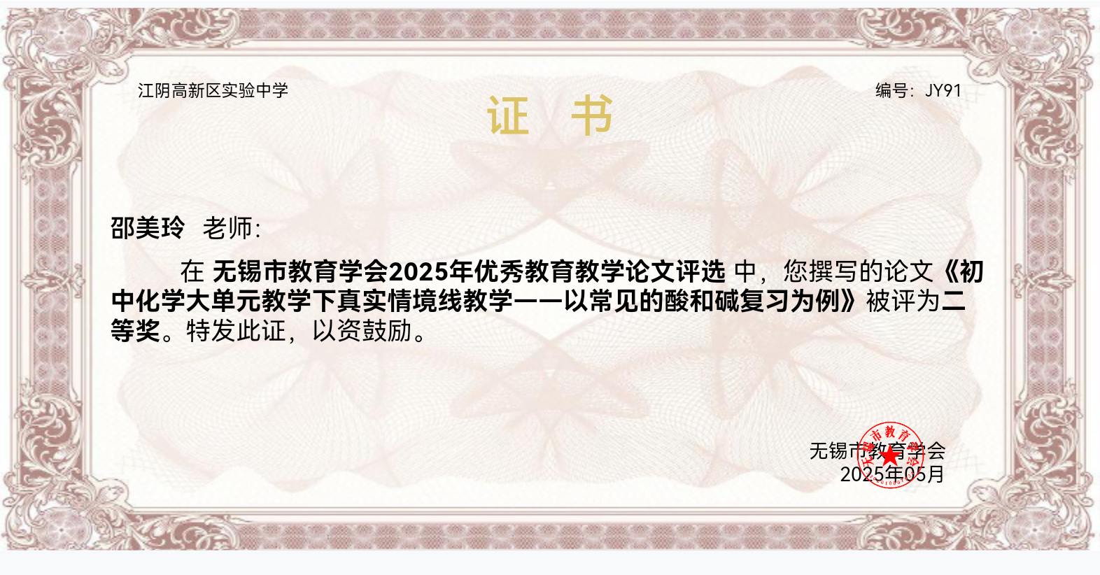 无锡教育会学教育教学论文评比二等奖