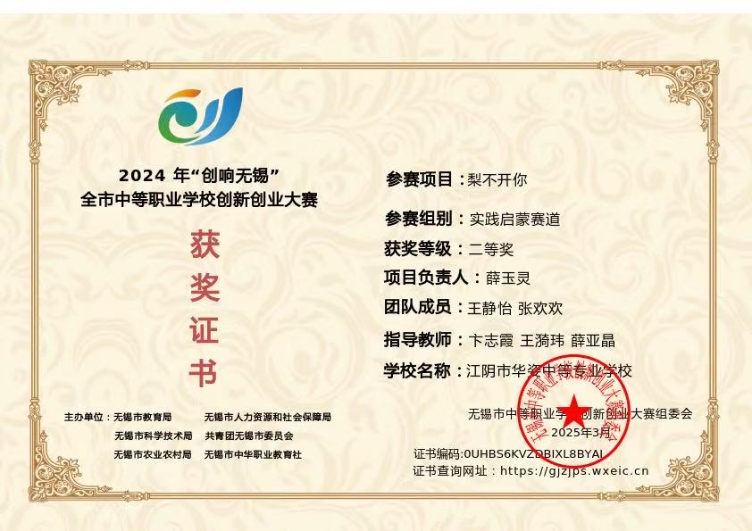 卞志霞、王漪玮老师的团队指导学生获2024 年”创响无锡” 全市中等职业学校创新创业大赛二等奖 2025-09-20