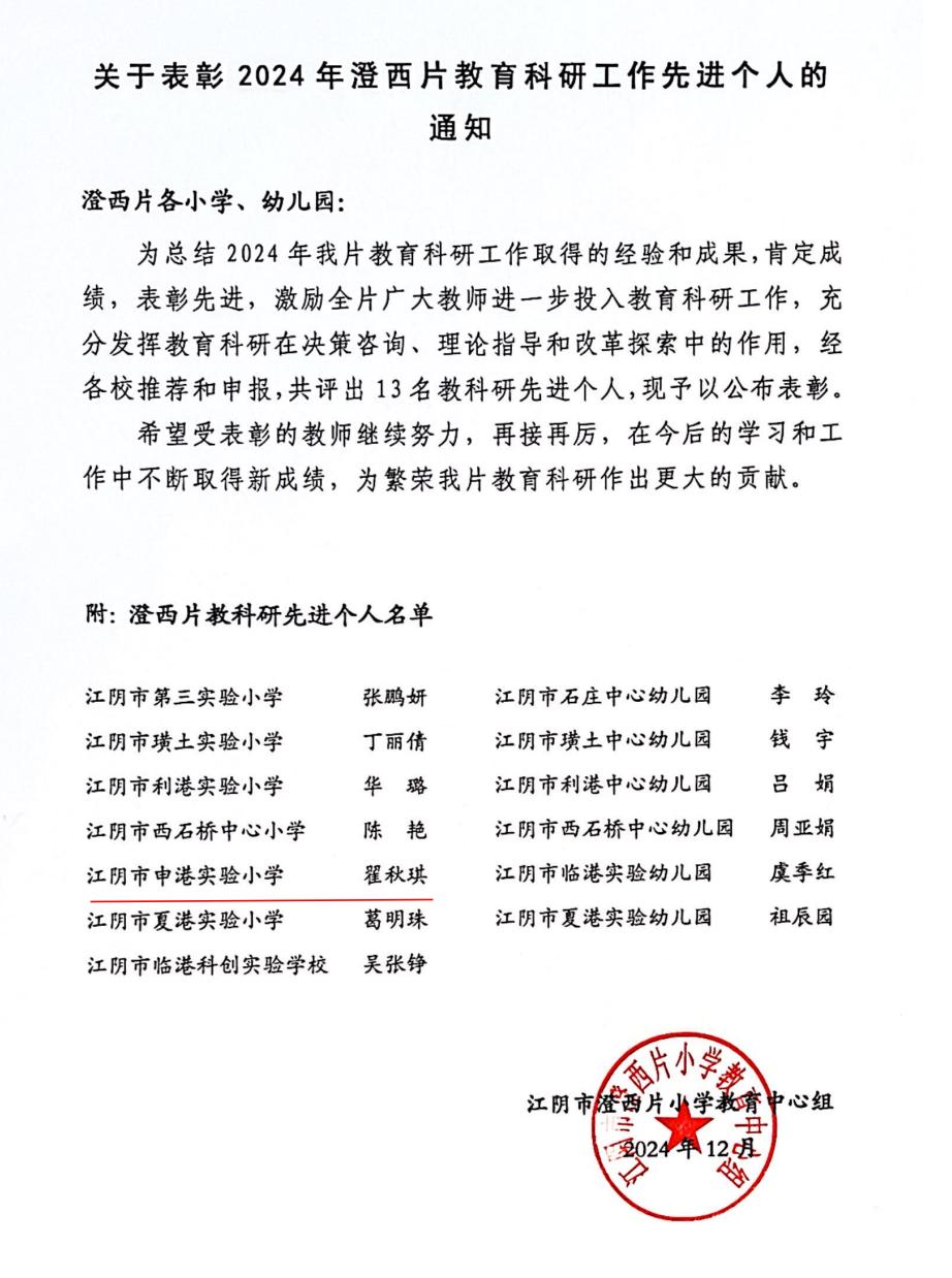翟秋琪被评为2024澄西片教育科研工作先进个人