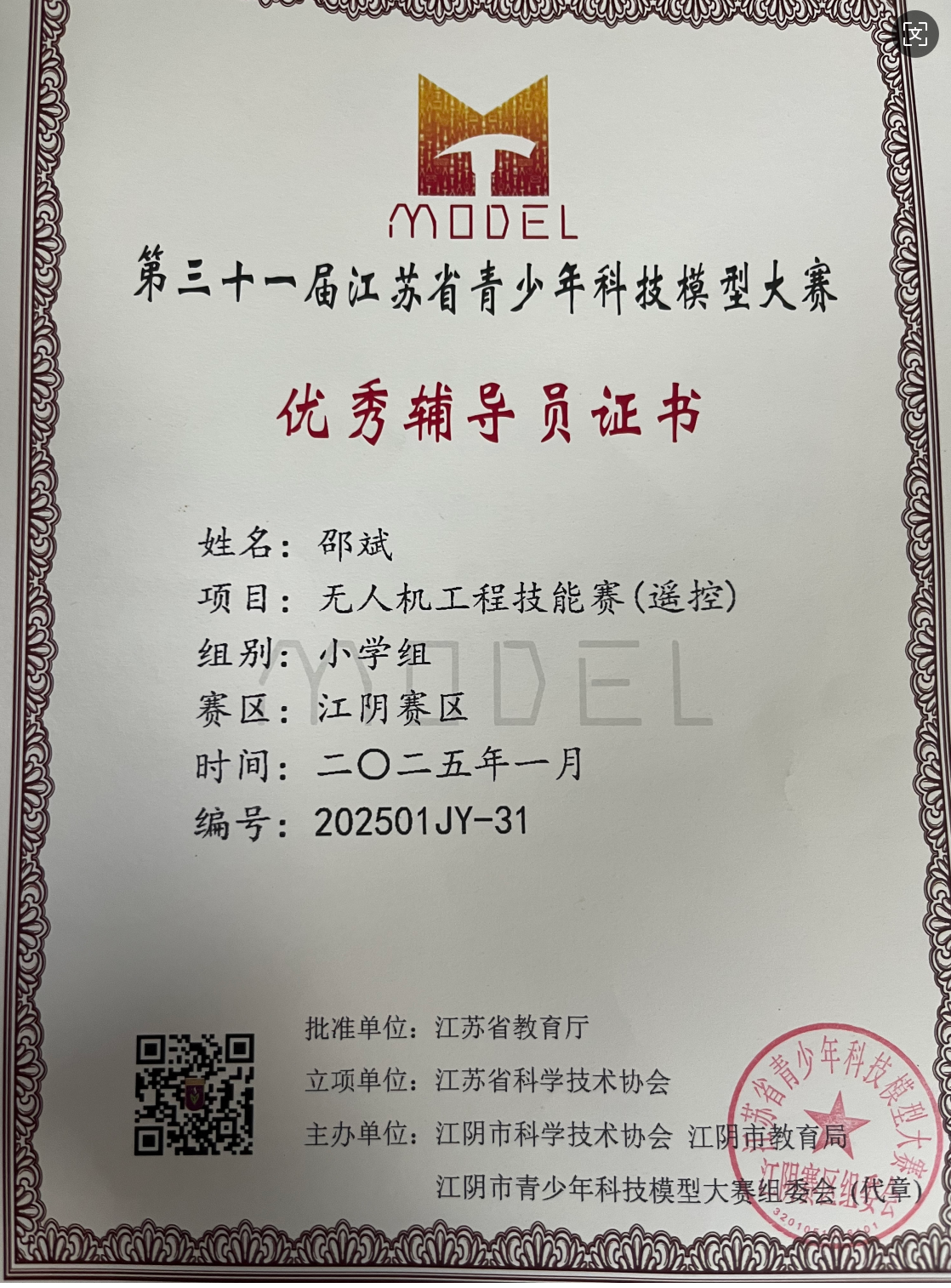 邵斌被评为第三十一届江苏省青少年科技模型大赛优秀辅导员 2025-09-20