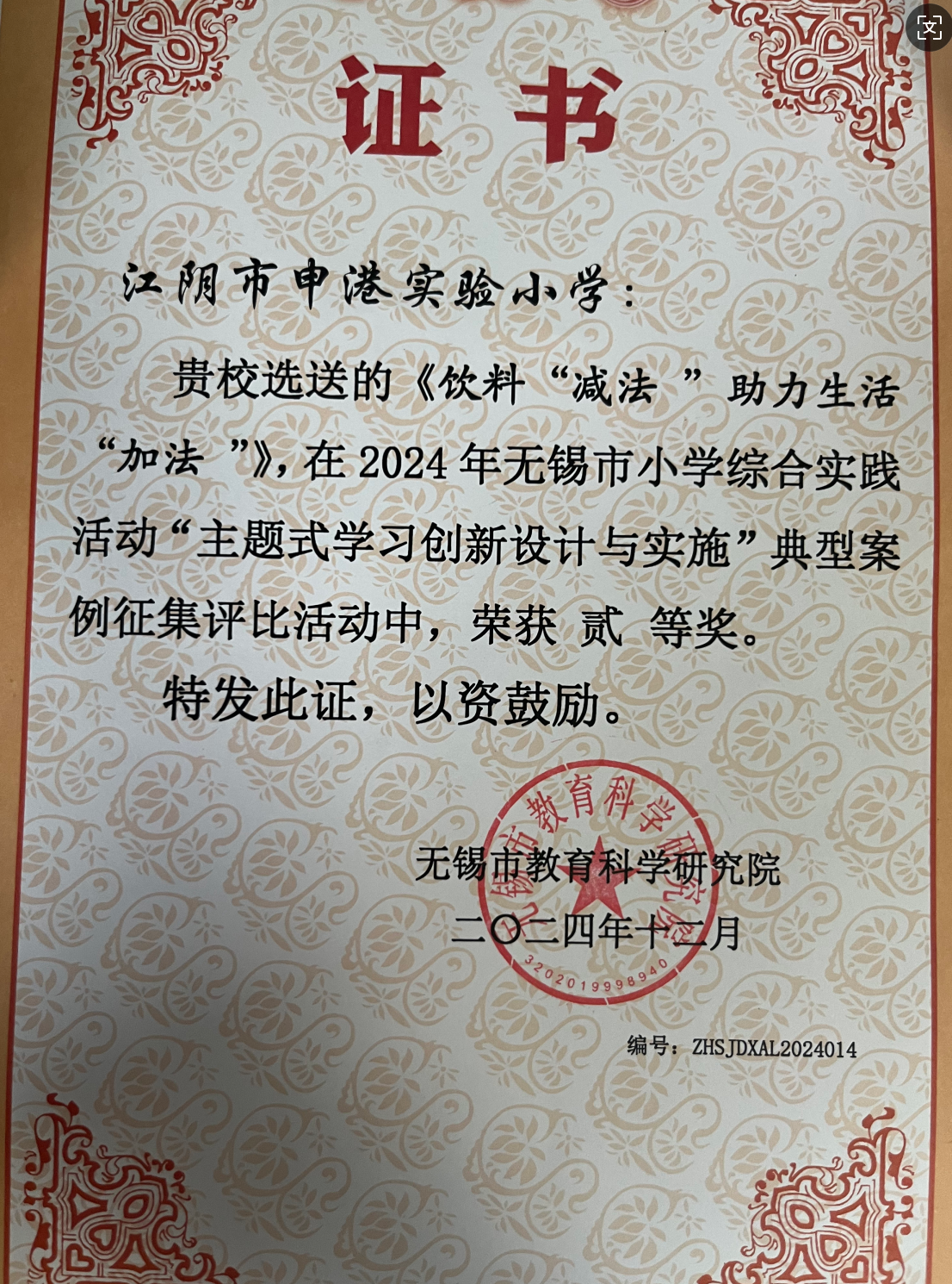 邵斌在2024年无锡市小学综合实践活动主题式学习创新设计与实施典型案例征集评比活动中获二等奖 2025-09-20