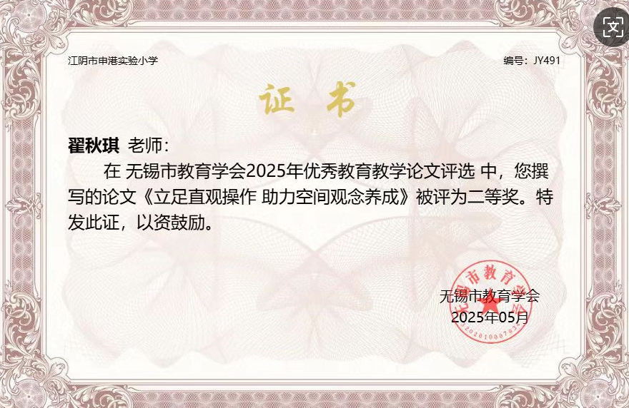 翟秋琪在无锡市教育学会论文中获得二等奖