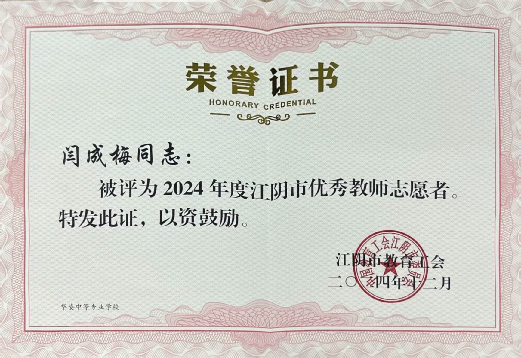 闫成梅同志被评为2024年度江阴市优秀教师志愿者