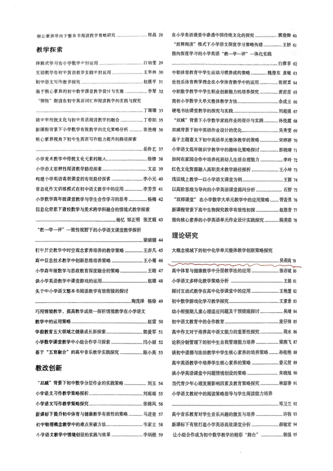 网站类目:研究成果获奖 姓名:吴莉莉 所在单位:江阴市夏港中学 获奖类别:论文 获奖级别:省级 获奖等级: 获奖时间:2024-10-09 评比部门: 发表刊物:《基础教育参考》 刊物级别:省级 发表时间:2025-09-20