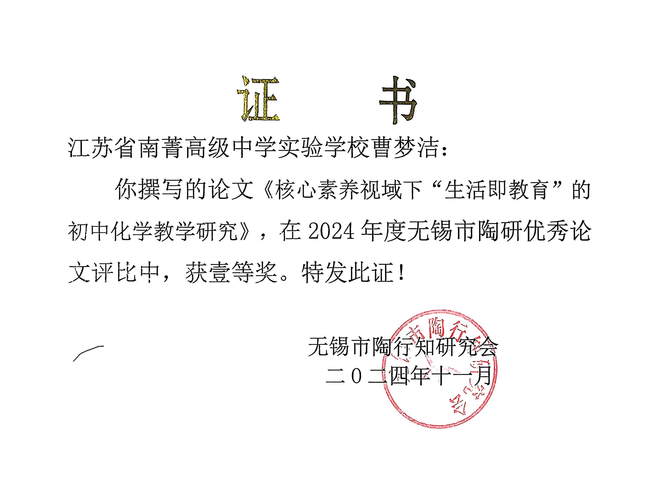 成员曹梦洁2024年无锡市陶研会论文一等奖 2025-09-21