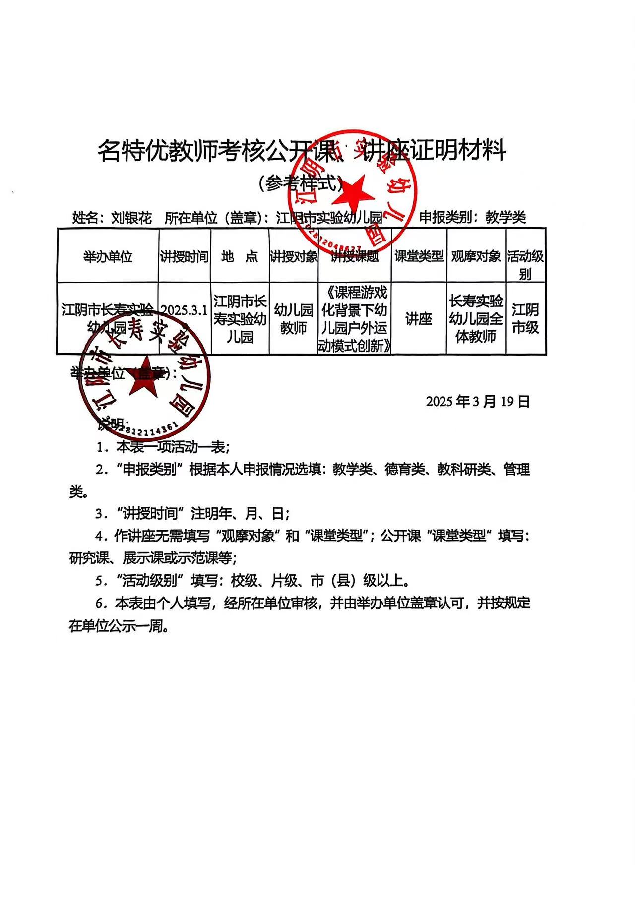 刘银花老师向江阴市长寿实验幼儿园全体教师作讲座《课程游戏化背景下幼儿园户外运动模式创新》