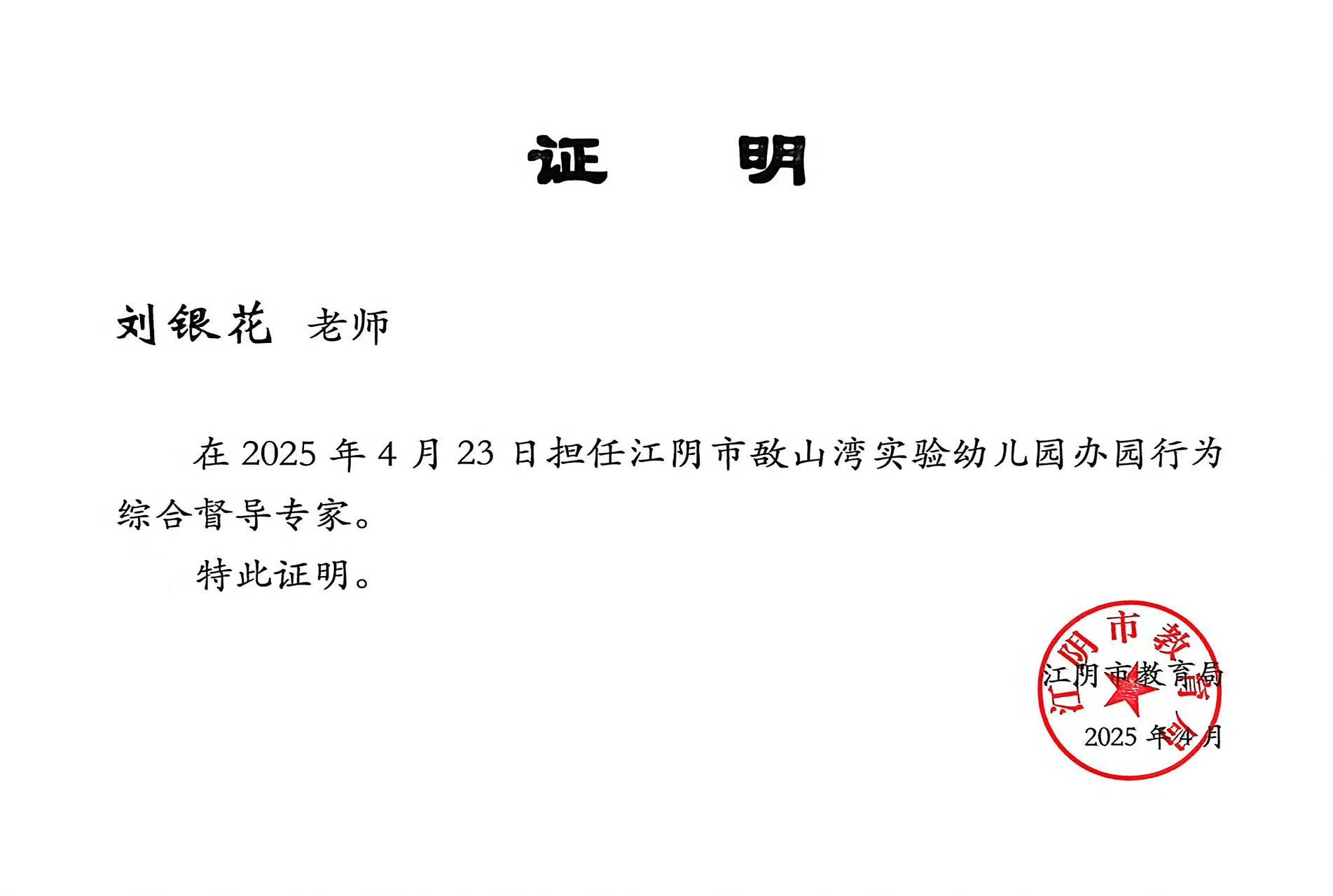 刘银花老师担任江阴市敔山湾实验幼儿园办园行为综合督导专家